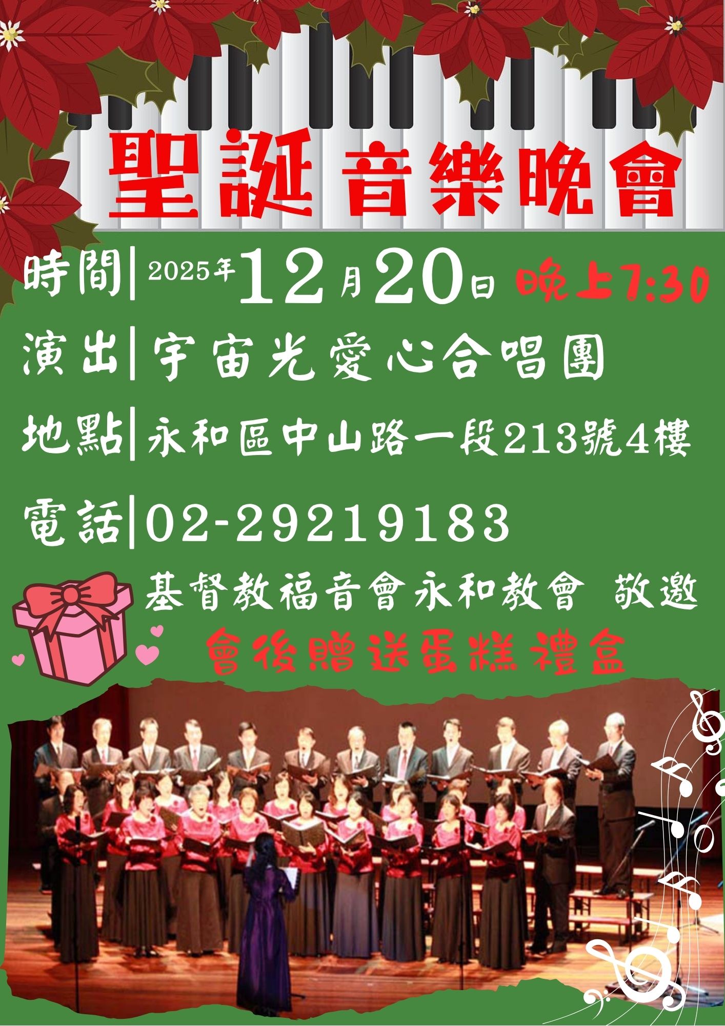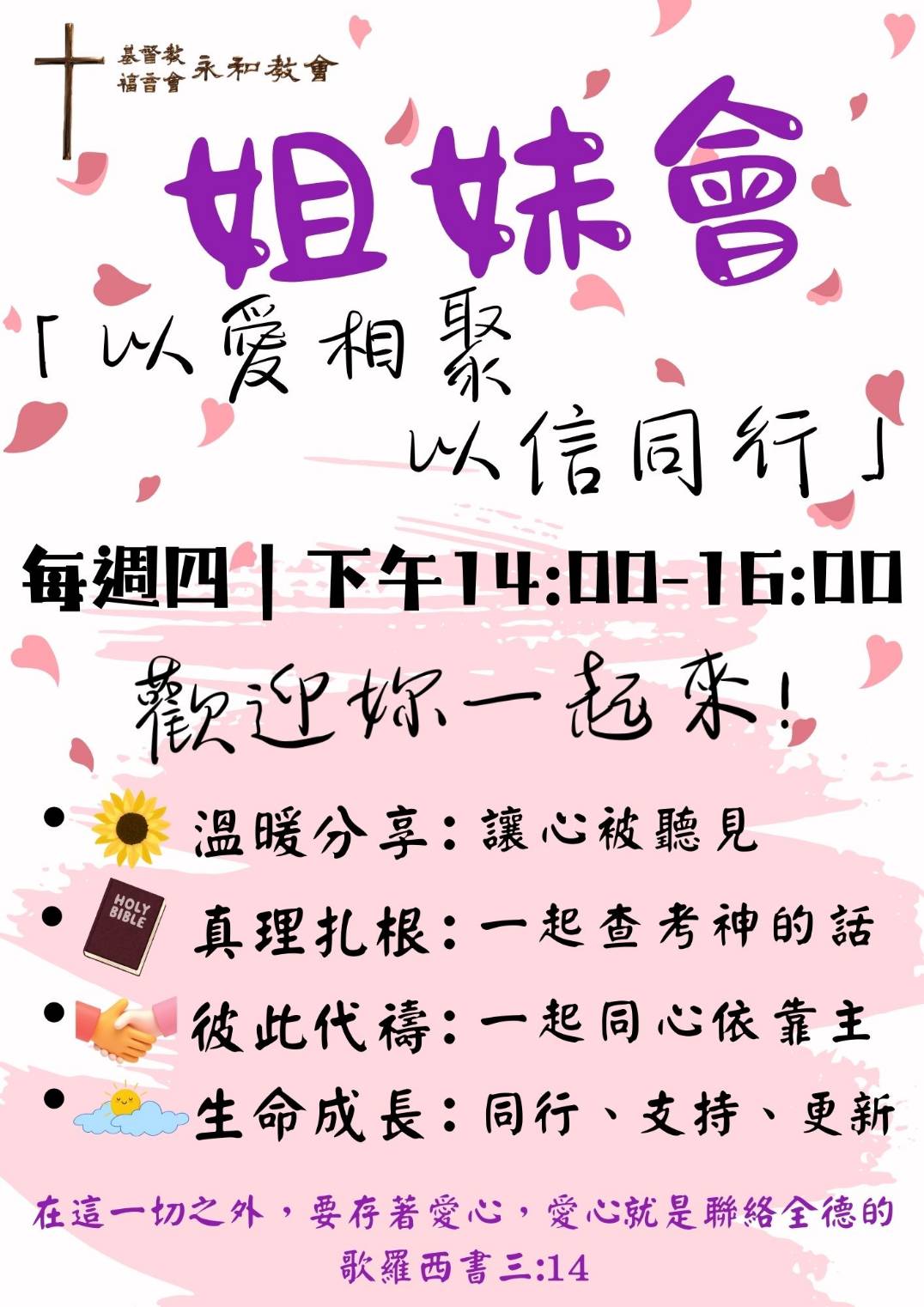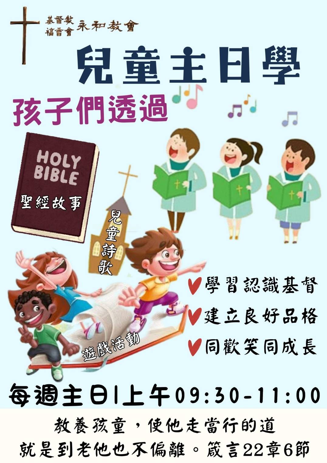 基督教福音會永和教會建堂簡史基督教福音會永和教會隸屬於「財團法人基督教台灣福音會」台灣福音會由德裔美籍孔彼得牧師 (Rev. Peter Kiehn)夫婦於1948年秋,開始其在台的傳道工作,迄1949年成立基督教台灣福音會。其後陸續設立台北伊寧街、永和、高雄鼓山、新興街、內壢等5所教會。1958年成立基督教福音會永和教會。教會以「聖經真理、實踐福音使命、建造主的教會」為核心。《箴言》9章10節 敬畏耶和華是智慧的開端,認識至聖者便是聰明。 主日直播 主日禮拜09:30-11:00 主日週報 成人主日學 兒童主日學 主日09:30-11:00 姐妹會 週四14:00-16:00 活動消息