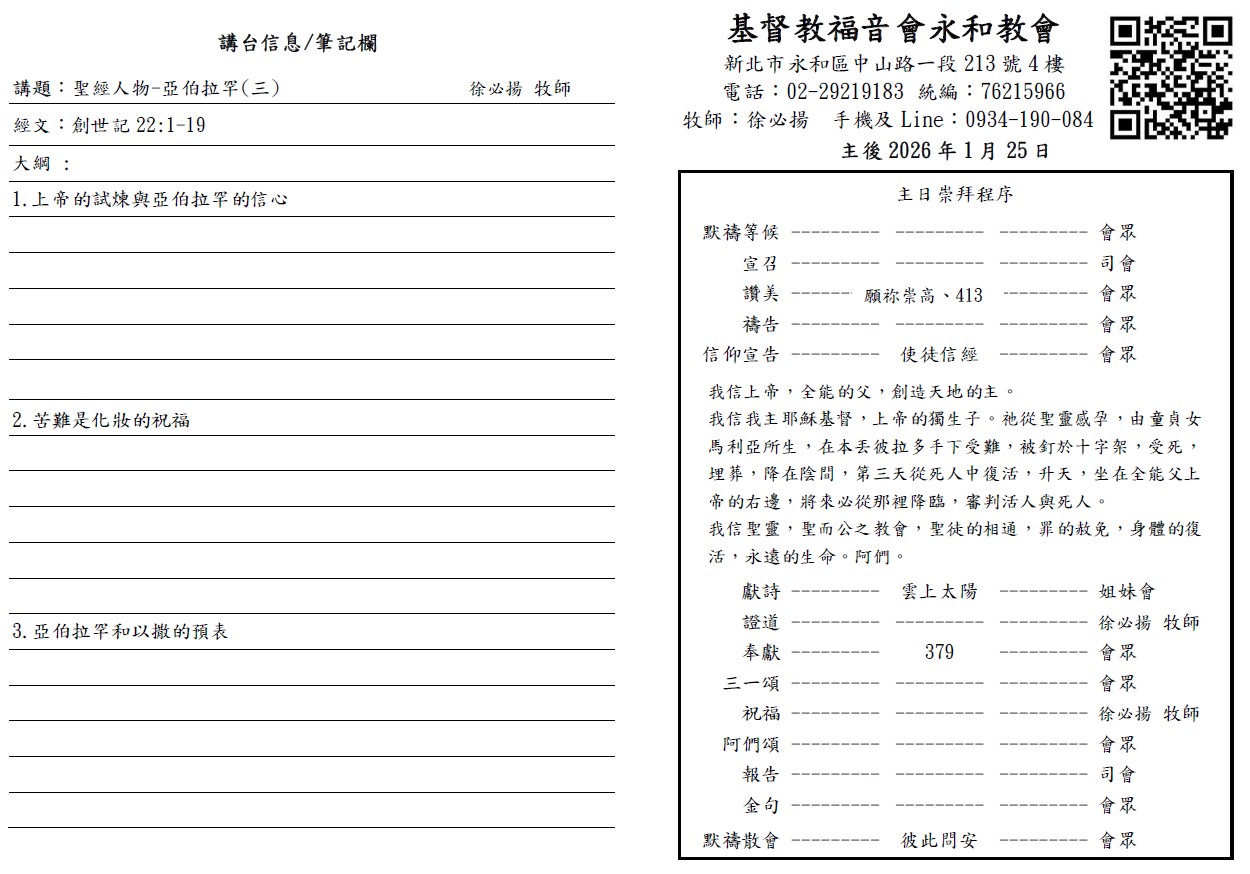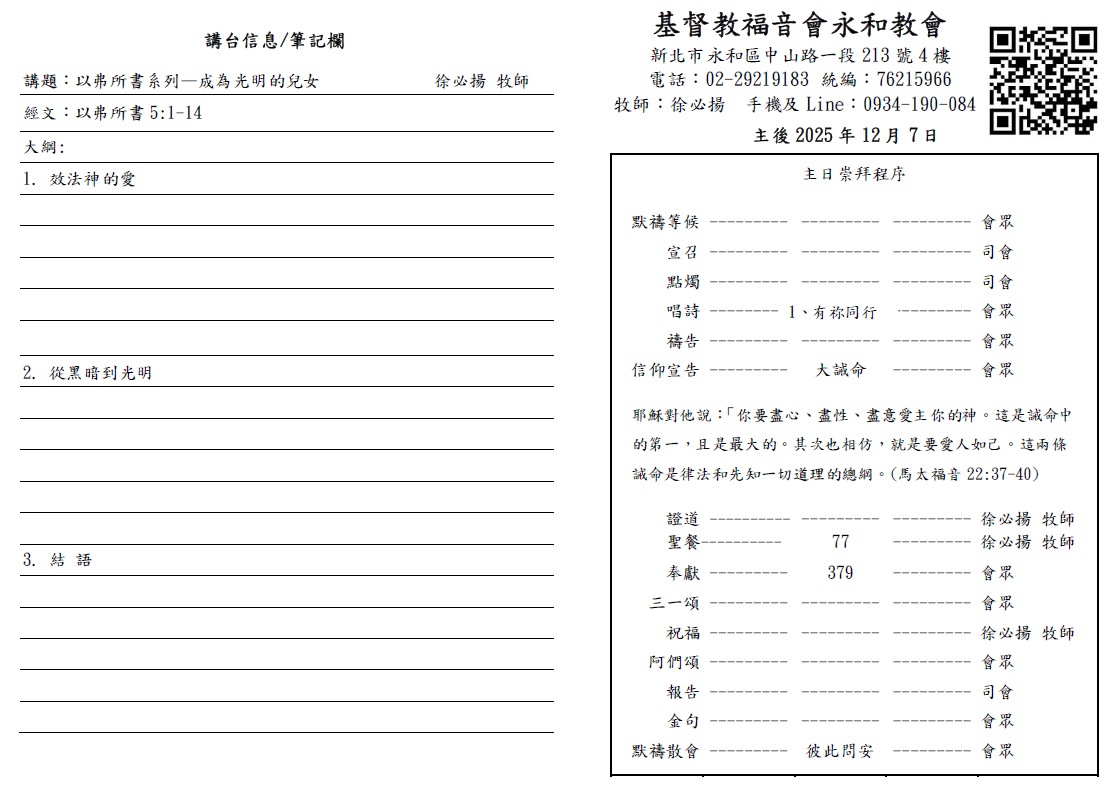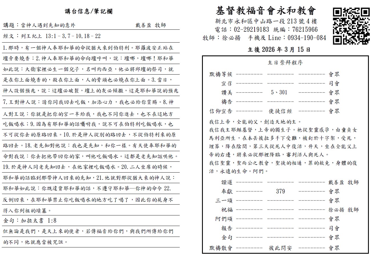 基督教福音會永和教會建堂簡史基督教福音會永和教會隸屬於「財團法人基督教台灣福音會」台灣福音會由德裔美籍孔彼得牧師 (Rev. Peter Kiehn)夫婦於1948年秋,開始其在台的傳道工作,迄1949年成立基督教台灣福音會。其後陸續設立台北伊寧街、永和、高雄鼓山、新興街、內壢等5所教會。1958年成立基督教福音會永和教會。教會以「聖經真理、實踐福音使命、建造主的教會」為核心。《箴言》9章10節 敬畏耶和華是智慧的開端,認識至聖者便是聰明。 主日直播 主日禮拜09:30-11:00 主日週報 成人主日學 兒童主日學 主日09:30-11:00 姐妹會 週四14:00-16:00 活動消息